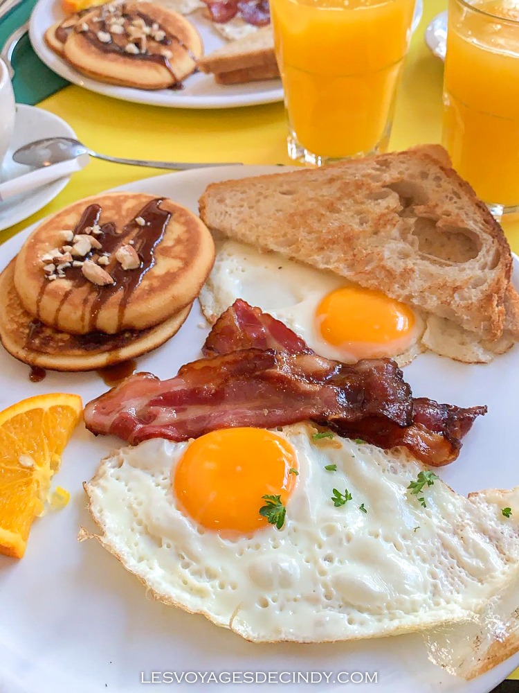 Pour « bruncher » ou simplement prendre le petit-déjeuner, on vous conseille le Chicago Café à côté de la place Sainte-Catherine. Conseillé par un habitant de la ville, ce restaurant sert le petit-déjeuner toute la journée. On y est allé à midi et on a commandé un petit-déjeuner américain. Une assiette composée d’oeufs au plat, de bacon et de pancakes. Le tout accompagné d’un café et d’un jus d’orange fraîchement pressé. La quantité était parfaite, on n’a pas eu faim avant longtemps. A tester absolument !