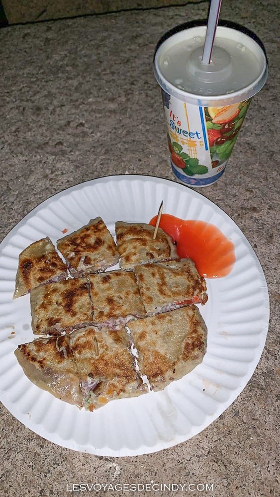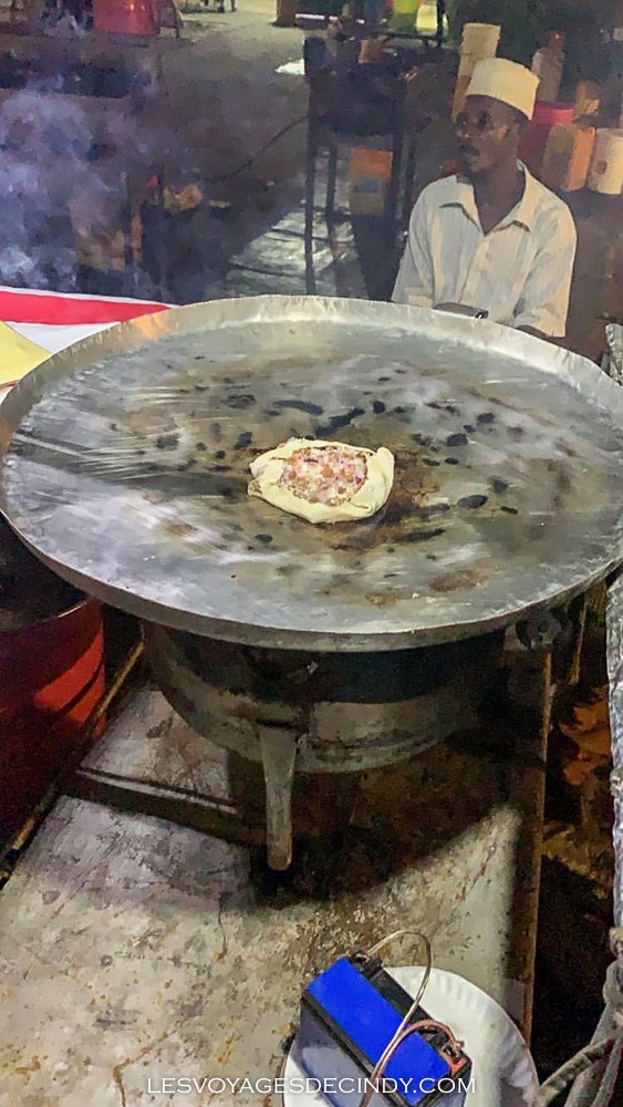 Nous ne sommes pas restés longtemps à la capitale mais on n’a pas raté l’occasion de découvrir le fameux marché de nuit de Forodhani Gardens où on peut manger la spécialité du coin, la Zanzibar pizza. Mais pas que ! On peut aussi déguster des brochettes de fruits de mer, boire du jus de canne par exemple. Honnêtement, j’avais un peu peur d’être malade (mauvais souvenir de notre fin de séjour à Bali) mais tout s’est bien passé. Tout ce qu’on a mangé était très bon et frais.